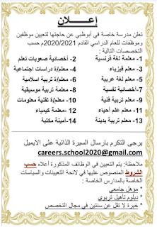 تعلن مدرسة خاصة في أبوظبي عن حاجتها لتعيين عدد كبير من المعلمين والمعلمات للعام الدراسي القادم 2020 / 2021م من جميع الاختصاصات والتي ستجدونها مذكورة في الاعلان الرسمي الموضح ادناه.